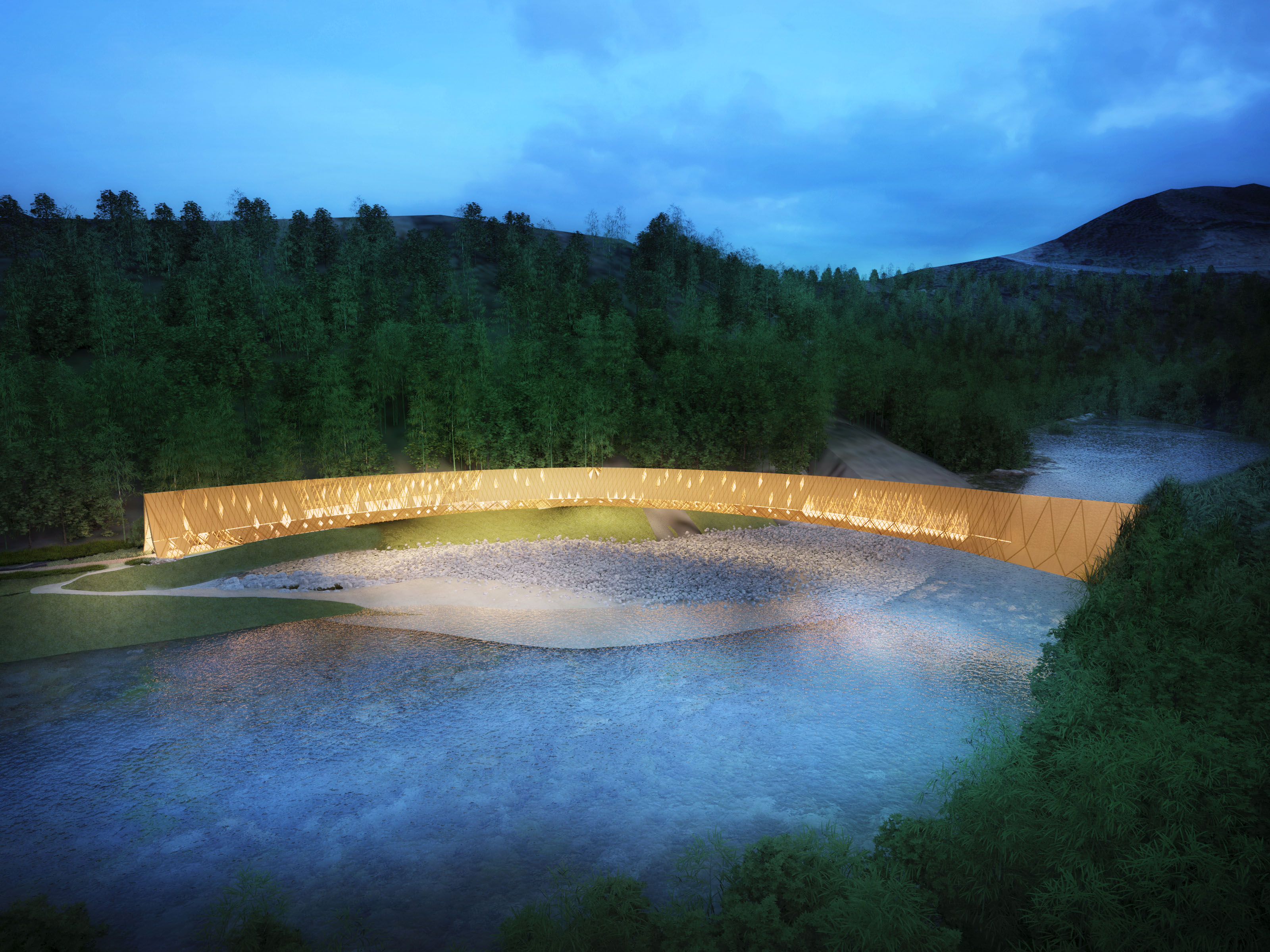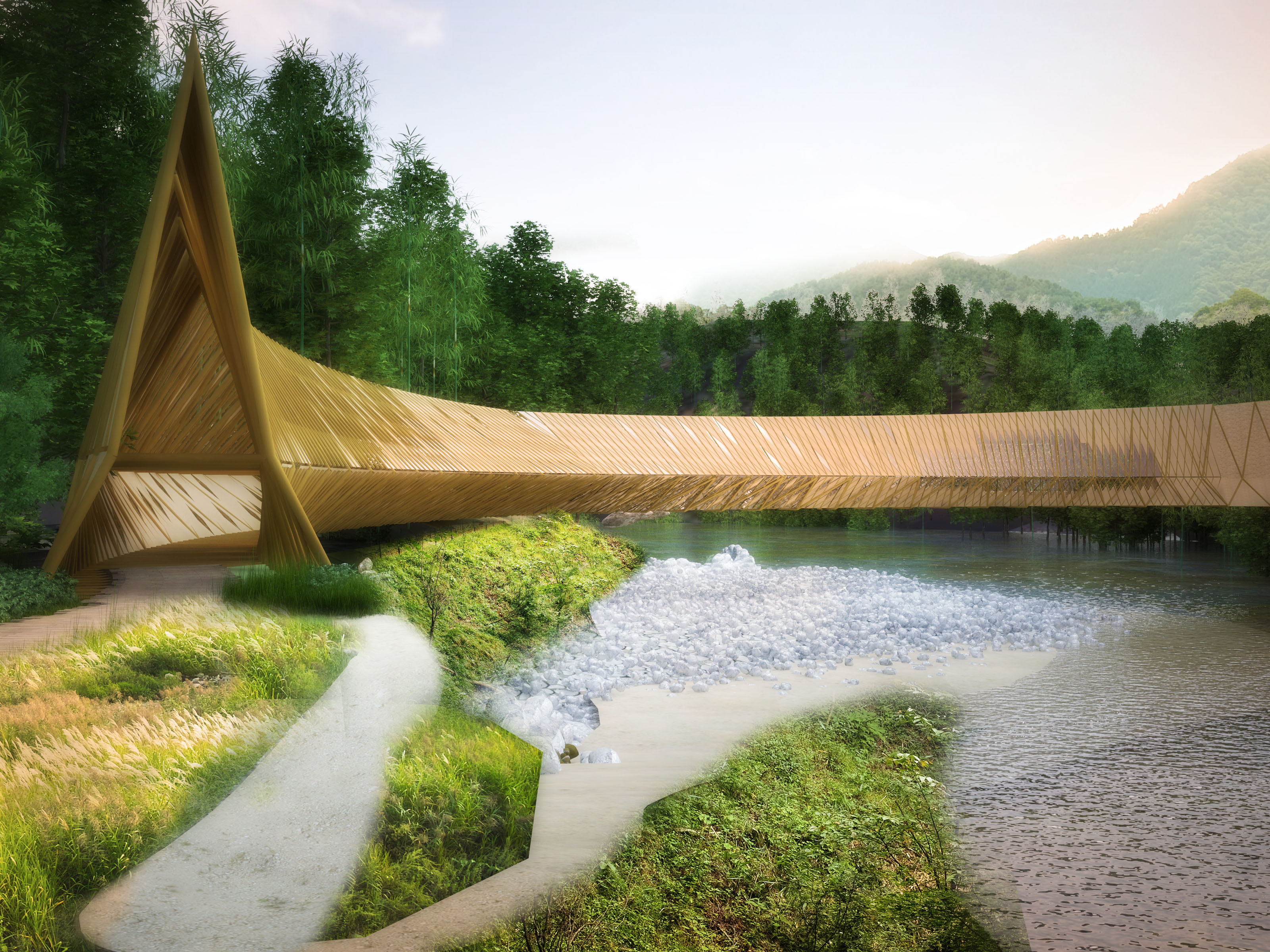 本提案は、廃線跡地を利用して失った地域の交通インフラを遊歩道として蘇らせるとともに、「自然の体幹装置としての新たなインフラ=地域の拠点」を整備する計画である。居場所としての橋梁をテーマに、多様な内部空間を寛容する構造形態のデザインを行った。